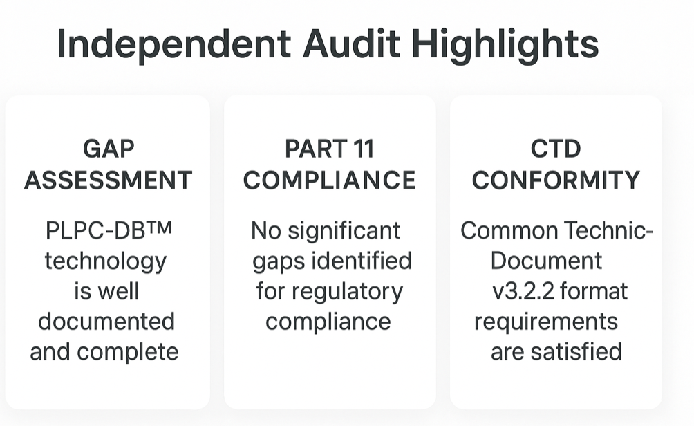 - Audit confirmation: Independent gap analyses by Veristat (USA) and Freyr (Global) confirmed compliance with 21 CFR Part 11, ICH Q6B, and CTD v3.2.2, certifying PLPC™ and STIP™ as “immediately bankable / audit-ready.”
