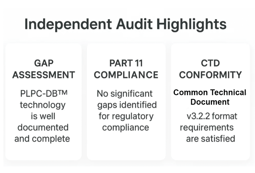 - Audit confirmation: Independent gap analyses by Veristat (USA) and Freyr (Global) confirmed compliance with 21 CFR Part 11, ICH Q6B, and CTD v3.2.2, certifying PLPC™ and STIP™ as “immediately bankable / audit-ready.”